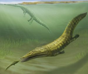 Por Agencia Los antiguos anfibios marinos Erythrobatrachus (en primer plano) y Aphaneramma (al fondo) nadando a lo largo de la costa del actual extremo norte