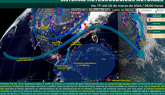 Este día, el Frente Frío No. 42 se desplazará sobre el Golfo de México y el oriente del país, interaccionará con un canal de baja presión sobre la Península de Yucatán y ocasionará chubascos, descargas eléctricas y posible caída de granizo en dicha península, además de lluvias aisladas en Veracruz. A su vez, la masa de aire frío asociada al frente, generará un refrescamiento de las temperaturas en el noreste y oriente del territorio nacional.