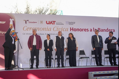 El gobernador Américo Villarreal Anaya, junto con el rector de la Universidad Autónoma de Tamaulipas (UAT), Dámaso Anaya Alvarado, encabezó este lunes la ceremonia de honores a la bandera y atestiguó la toma de protesta de la Dra. María Guadalupe Vázquez Salazar como directora de la Facultad de Enfermería Victoria para el periodo 2026-2029.